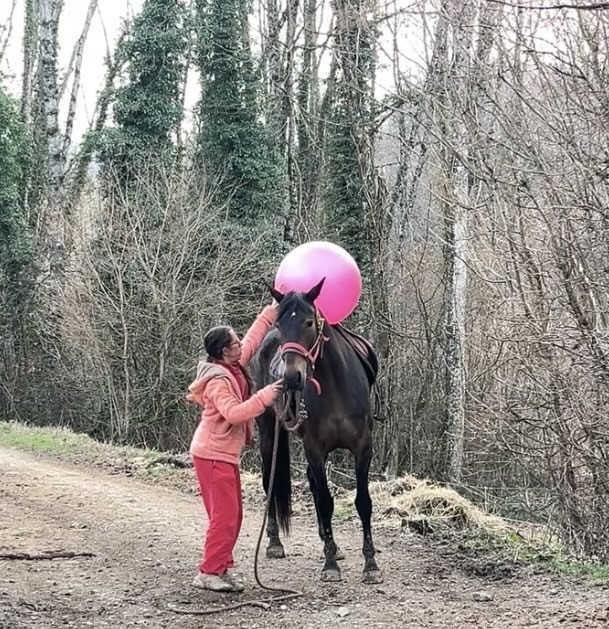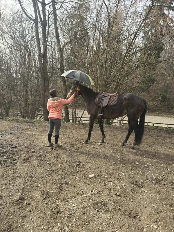 Elle a déjà été désensibilisée et a vu : sac plastique, drapeau, parapluie et spray, qu’elle accepte correctement. La douche est également en cours d’acquisition.