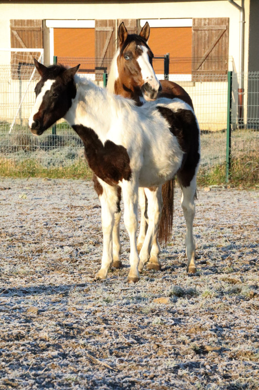 Mâle né en juin 2025, issu du croisement de Jolie Môme de Gouvix (PH) et Hasparren de pericard (Oc selle ligné sitôt liberté/Aiglon rouge) . Pie bai, il devrait toiser environ 1m55.