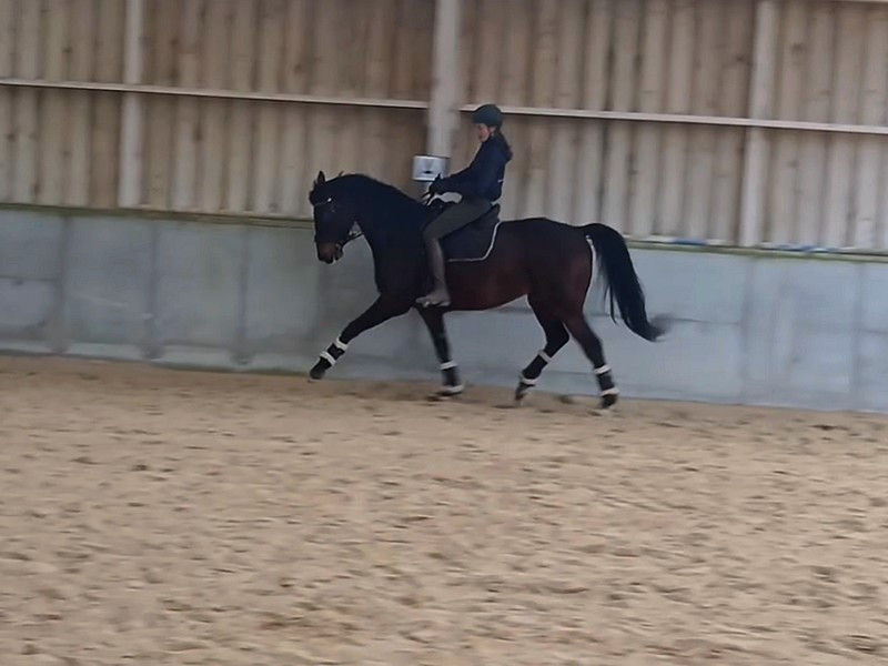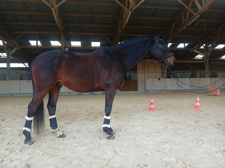 A débuter le dressage tardivement l’année de ses 7 ans (à concouru CCE jusqu’en CCI**S avant, mais le cross ce n’est pas son truc). Saute encore à la maison, part seul ou accompagné en balade, excellentes bases de travail à pied/en liberté. Maîtrise les mouvements de l’amateur 1 GP, appuyers, changements de pieds…commence à acquérir les changements de pieds rapprochés (3 temps).