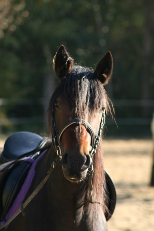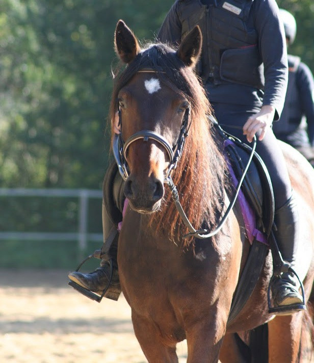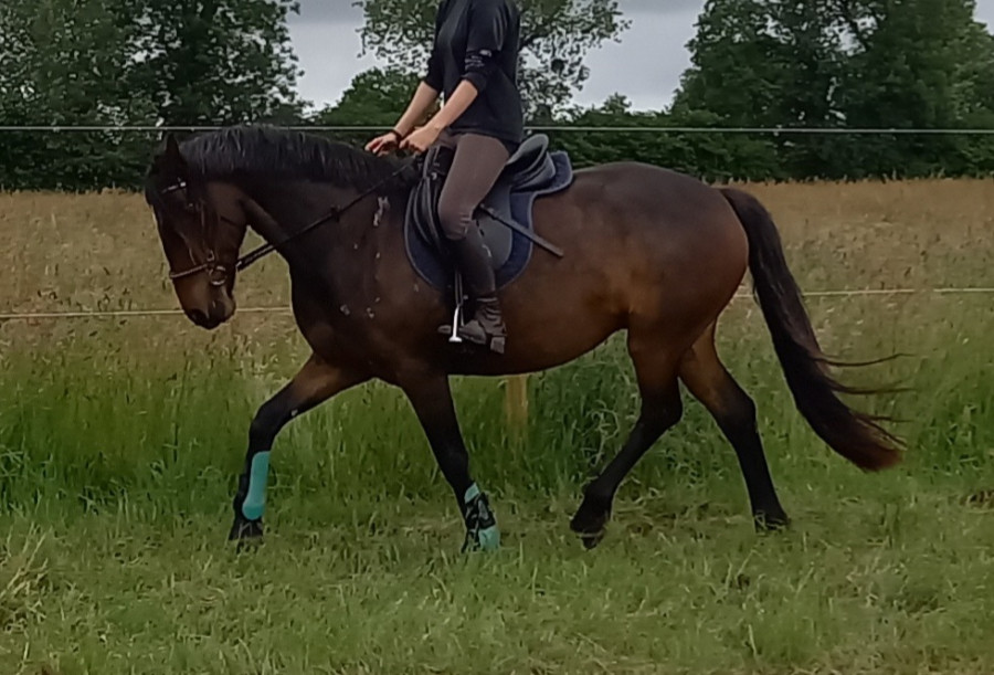 A remettre en route sous la selle suite soucis de santé de sa cavalière monitrice, mais travaille régulièrement à pied (longe, longues rênes, liberté)