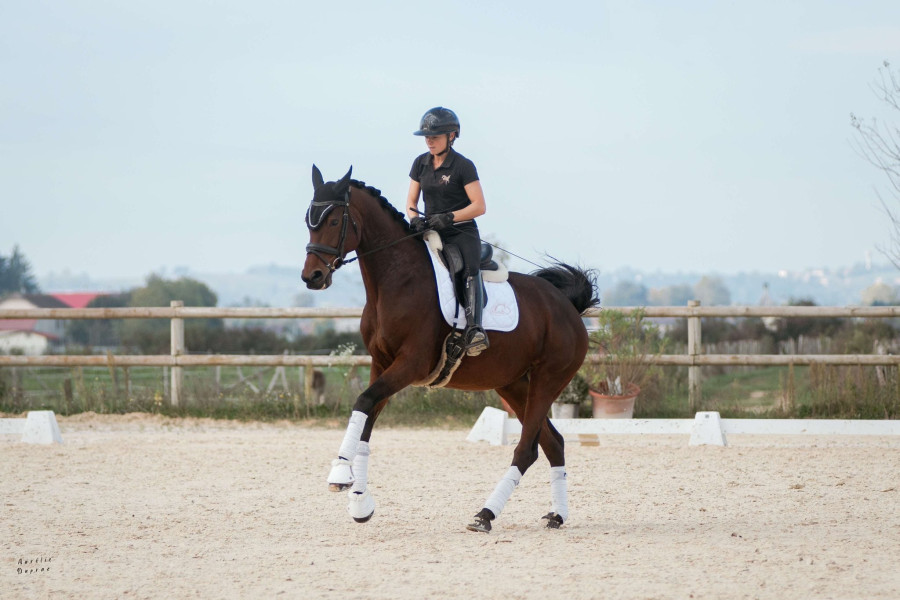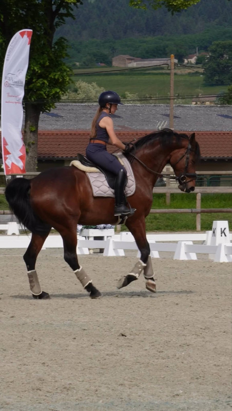 Sous la selle, elle offre de belles allures, avec un pas ample et régulier, un trot expressif et actif, et un galop équilibré, laissant entrevoir une marge de progression intéressante vers le rassembler. Elle maîtrise actuellement les appuyers, les changements de pied rapprochés, et commence le travail des demi-pirouettes, montrant une bonne compréhension des exercices et une réelle capacité à évoluer vers un travail plus technique. Présentée en compétition, elle possède une expérience en épreuves Avenir 2, confirmant sa capacité à sortir en concours et à s’exprimer dans un cadre compétitif.