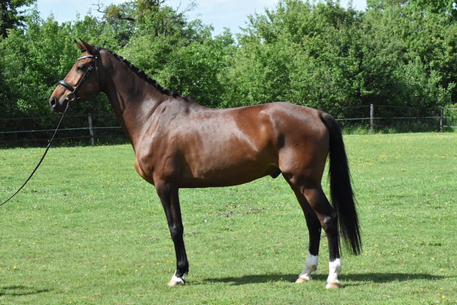 Sorti en épreuves amateurs dressage et CSO. Potentiel amateur 1 dressage, à finir de former. Maîtrise cession, épaule en dedans, hanches en dedans, ferme à ferme, changement de pieds.