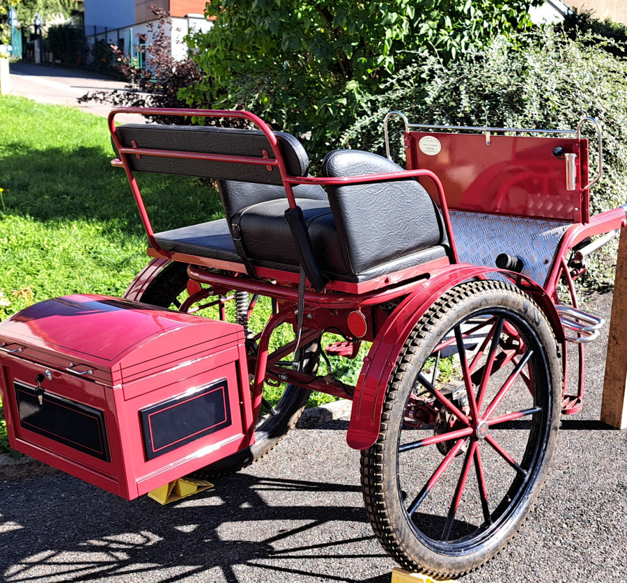 Siège meneur réglable, freins à disques, suspension à ressorts, garde-boue métallique rouge, brancards et supports brancards en inox, compteur de vitesse, sol aluminium.