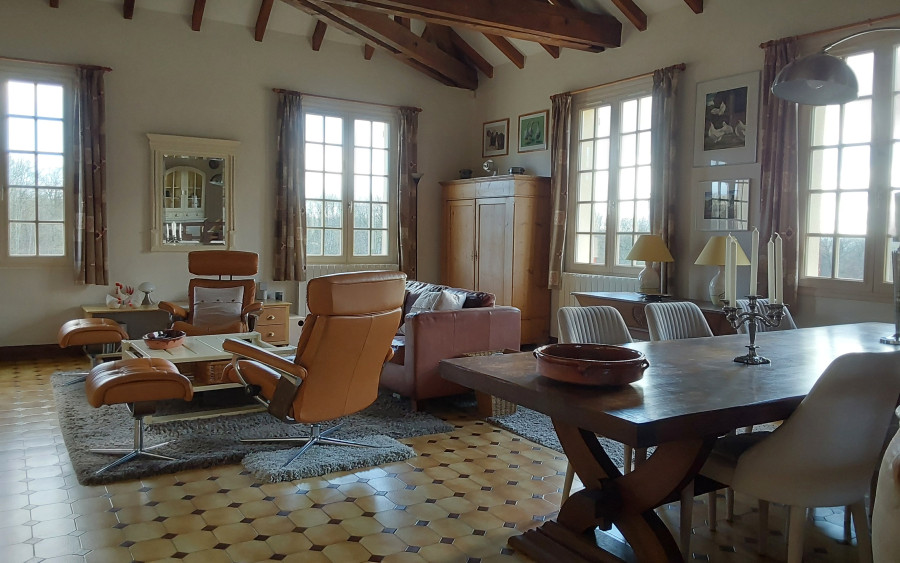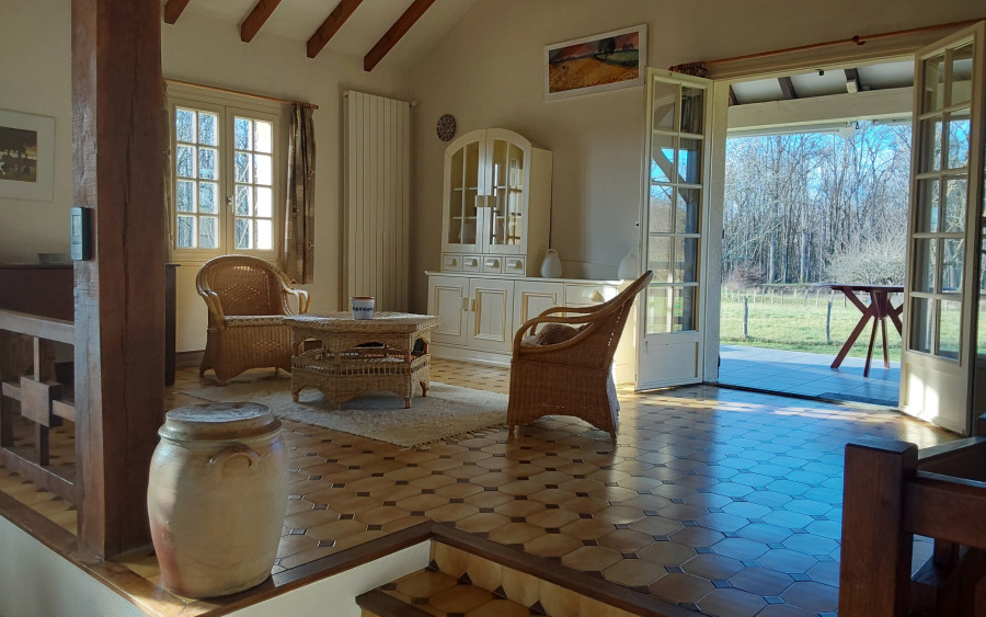 Grand salon 77m2 avec insert, donnant sur une jolie terrasse couverte surplombant le jardin avec des arbres, verger et potager.