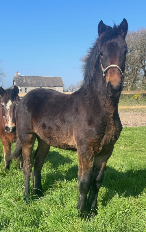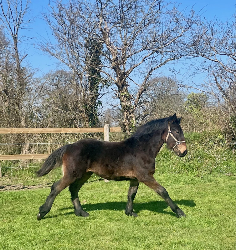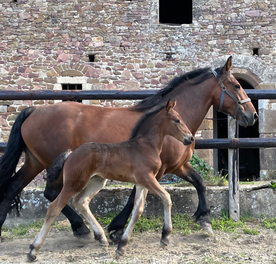 C’est une pouliche énergique et téméraire qui apprend très vite, elle sera porteuse et toisera aux alentours de 1,62m. Elle excellera en loisirs, rando, attelage, etc ?