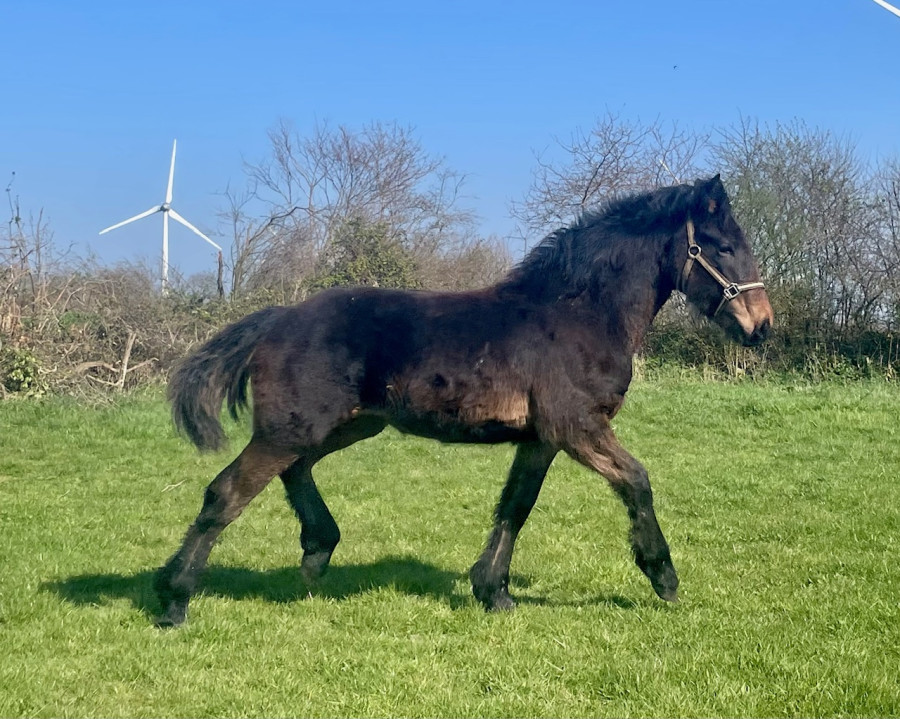 Plume Deham, pouliche papiers AES issue du mariage entre Eole du Bray, Cob Normand évoluant en attelage (familial) et Ulbe 506, étalon frison PP agrée et Sport exporté aux USA.
