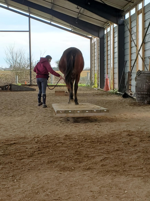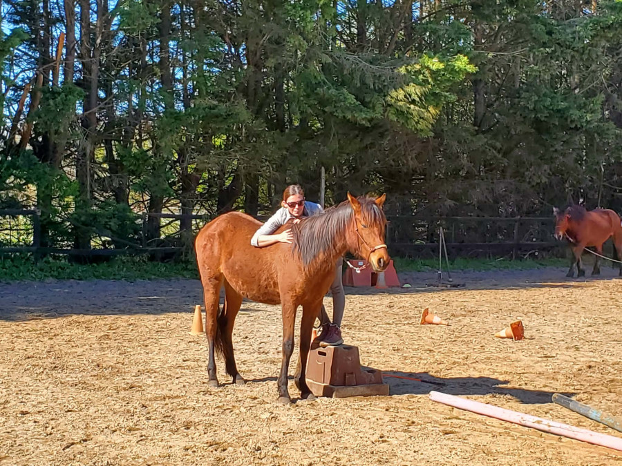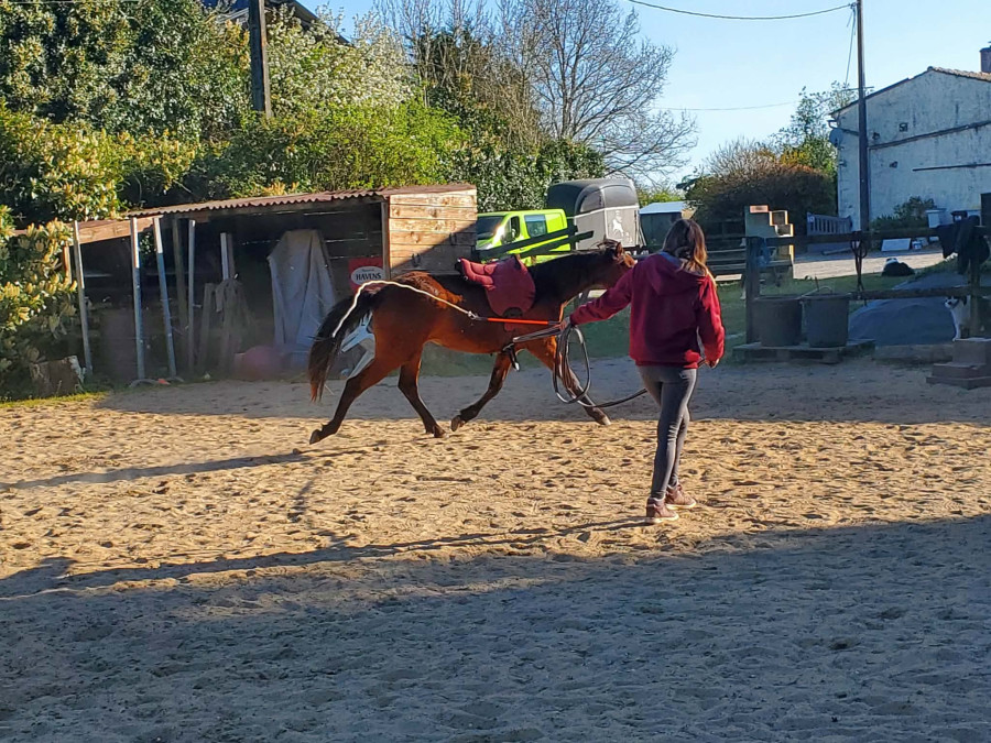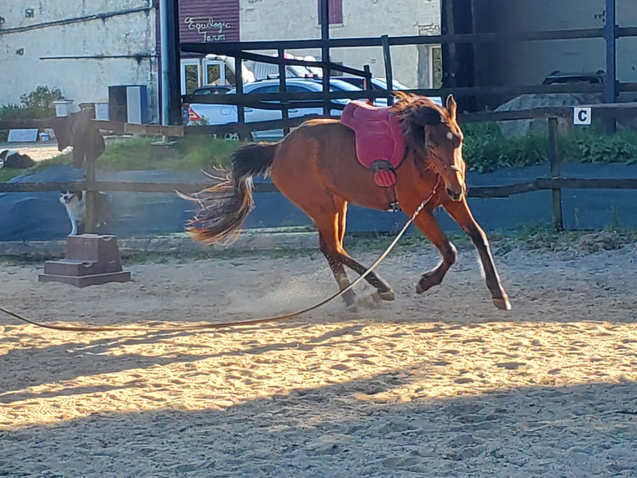 Oracle est actuellement au travail dans une pension orientée éthologie. Elle a déjà acquise de bonnes bases et commence un pré-débourrage progressif. Elle est manipulée, à l'aise dans tous les actes de pensage, marche en main et a les bases du travail à pied.