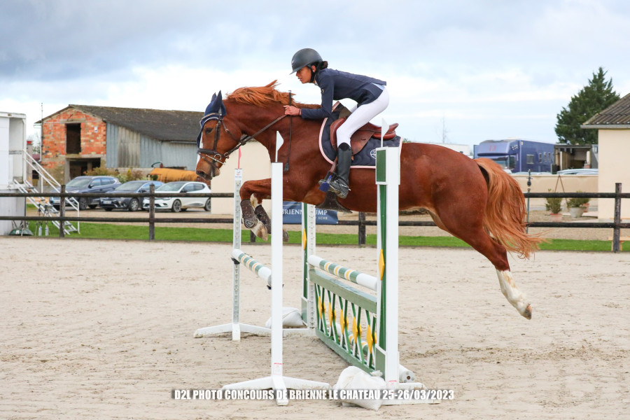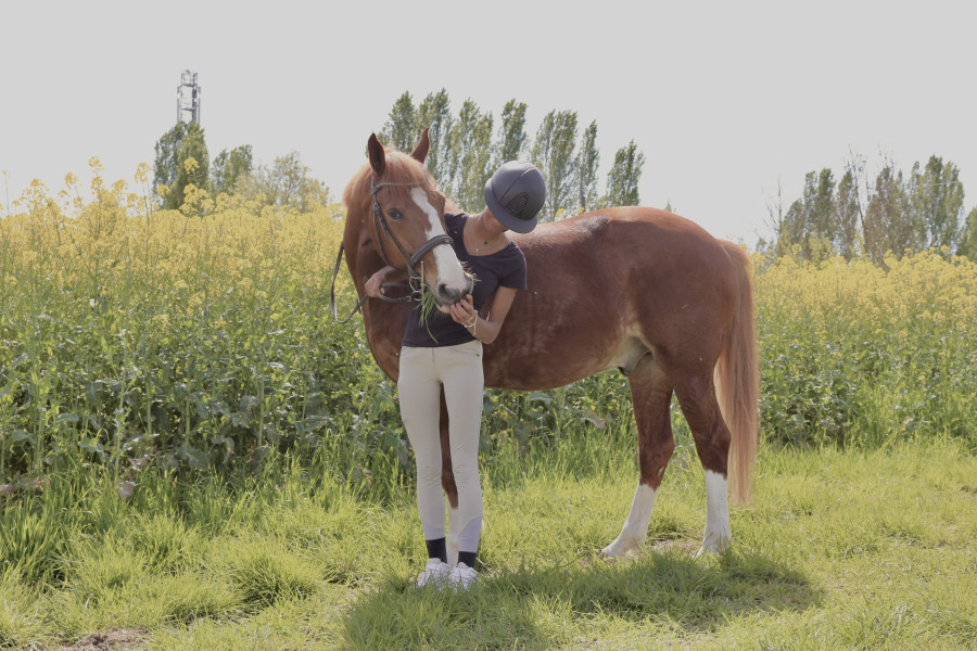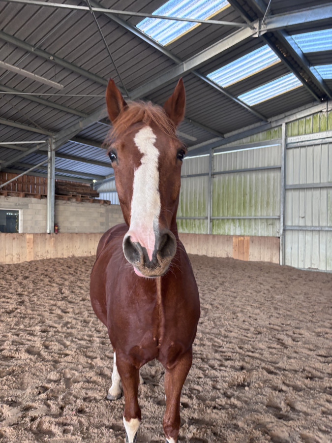Il a de bonnes bases — il monte en camion sans problème, se balade volontiers et a quelques bases en dressage. Il a réalisé des parcours sans fautes en amateur 3 (1m) et peut continuer à sauter occasionnellement, mais nous le destinons à un usage loisir.