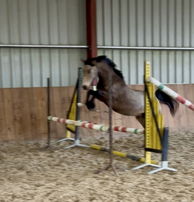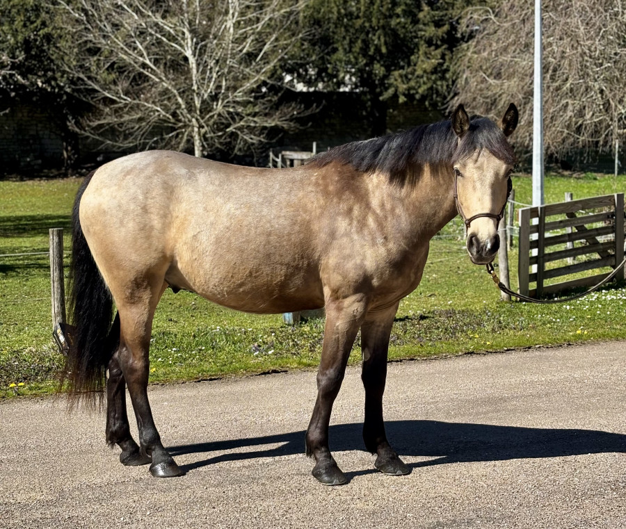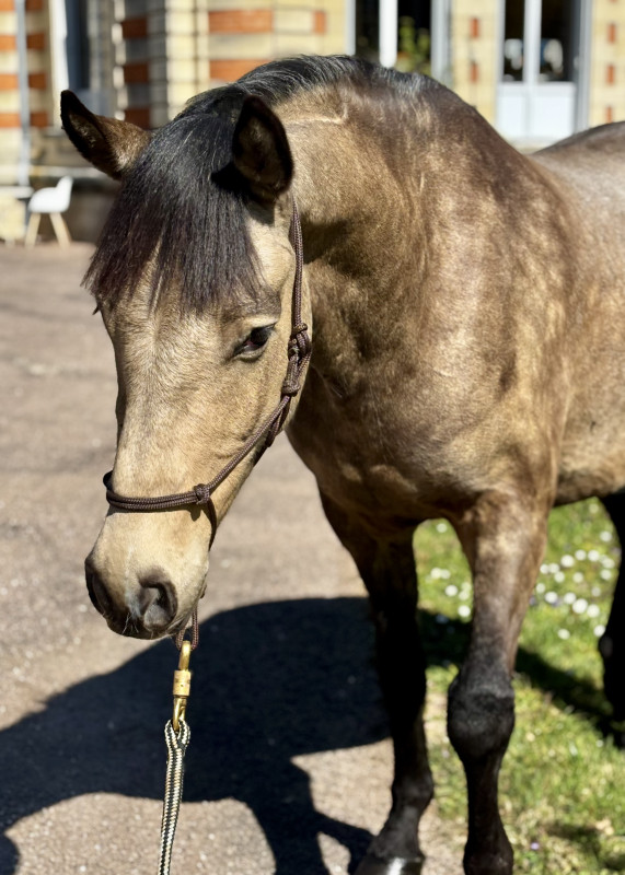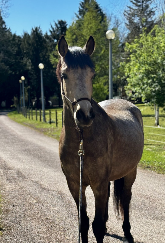 Débourré, monté aussi bien par des grands cavaliers que des débutants. Passe partout en balade. Commence le travail en carrière.