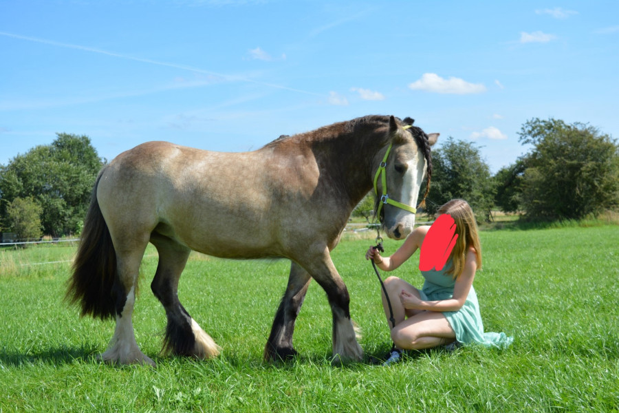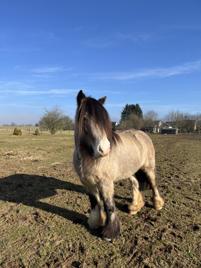 Jument Irish Cob de 7 ans toisant environ 1m55 avec une robe Isabelle. En ordre de vaccin, vermifuge, dentiste et parage. Cheval non débourré, non ferré mais manipulé. Elle a déjà eu quelqu'un sur son dos, avec une selle et avec un mors, mais le travail n'a pas été approfondi.