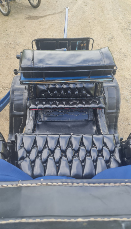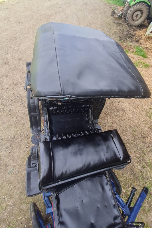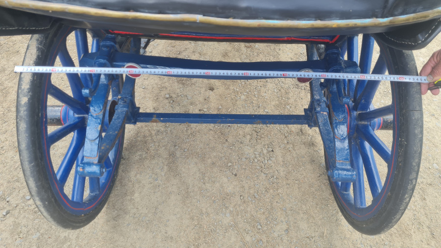 - Calèche élégante et légère. Peinture bleue avec filets rouges.