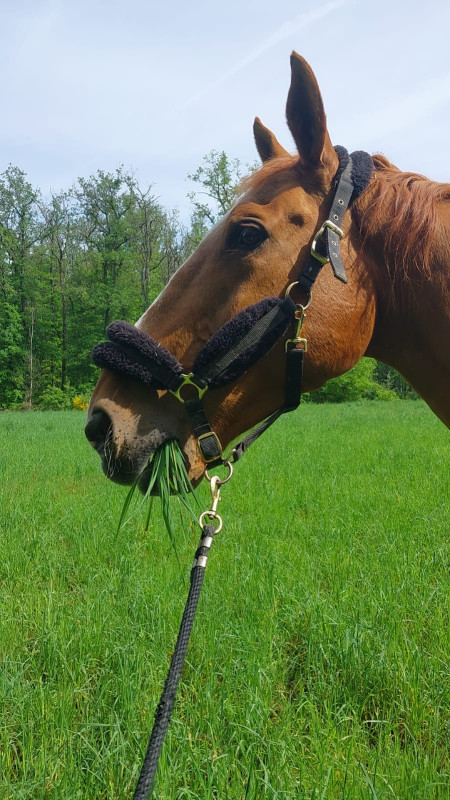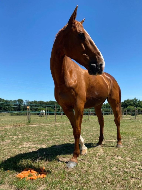 Je propose une demi-pension sur Tarzan, grand cheval de 18 ans (ne fait pas son âge), que j’ai depuis 10 ans.