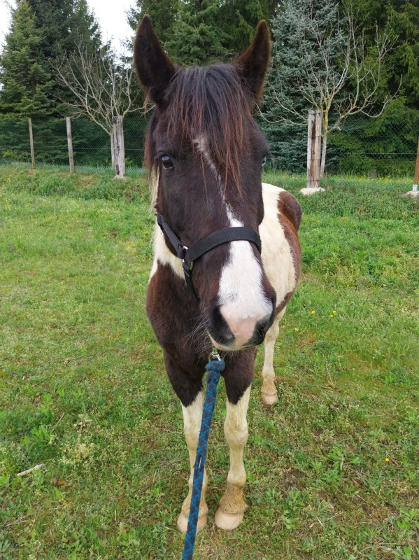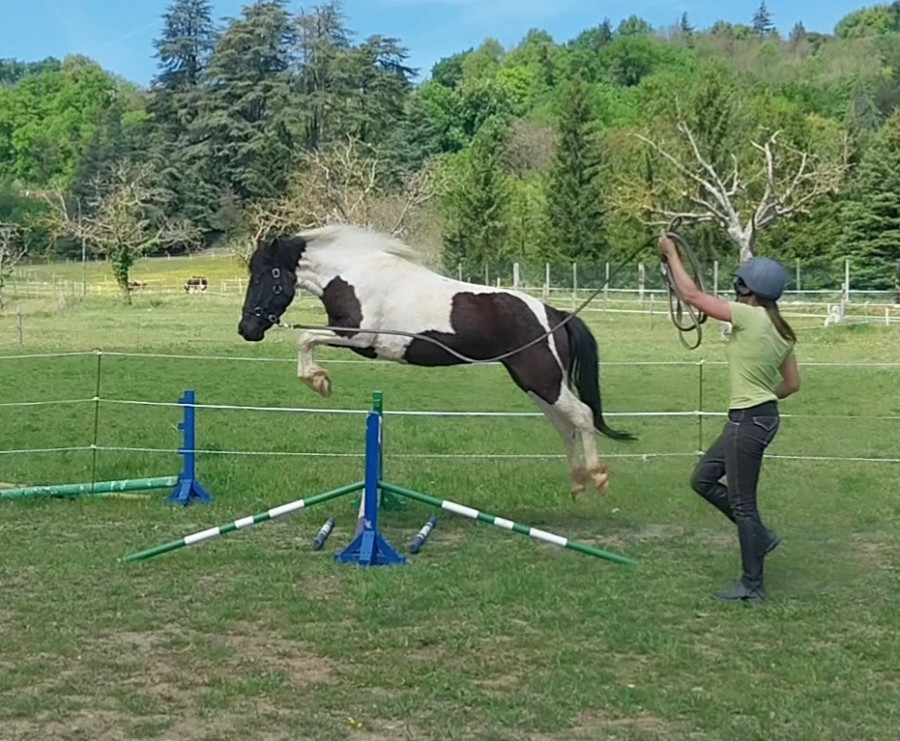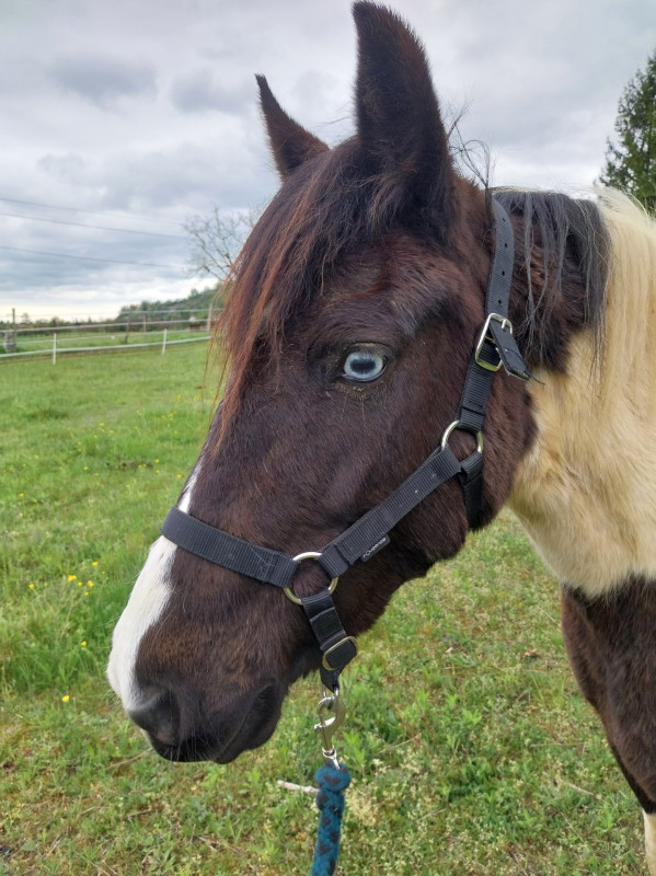Très belle ponette pie aux yeux vairons, Ipie a été debourrée l'année dernière et a fait un peu de club. Très proche de l'homme et grégaire, elle a un très bon coup de saut à travailler