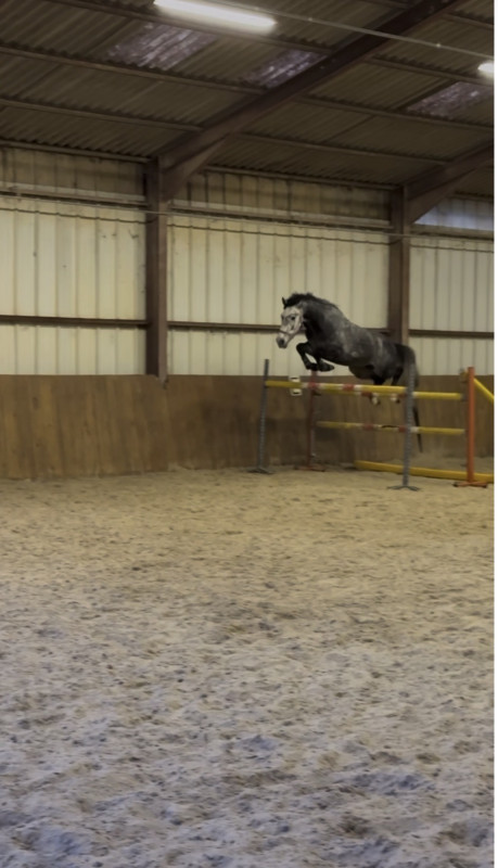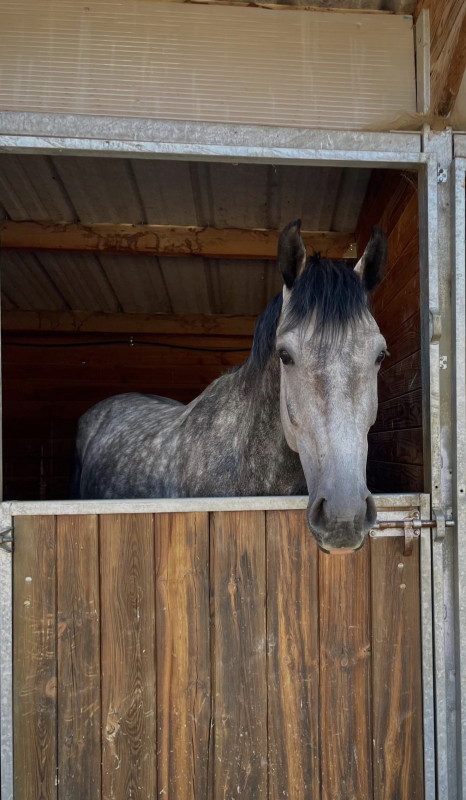À vendre, élégant hongre KWPN de 6 ans (né en 2020), robe gris pommelé, toisant environ 1m65.