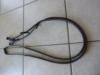 À propos : Filet avec muserole croisé, neuf jamais utilisé, de couleur marron. Vendu avec les rênes. Prix 45 euros. Taille full (cheval).