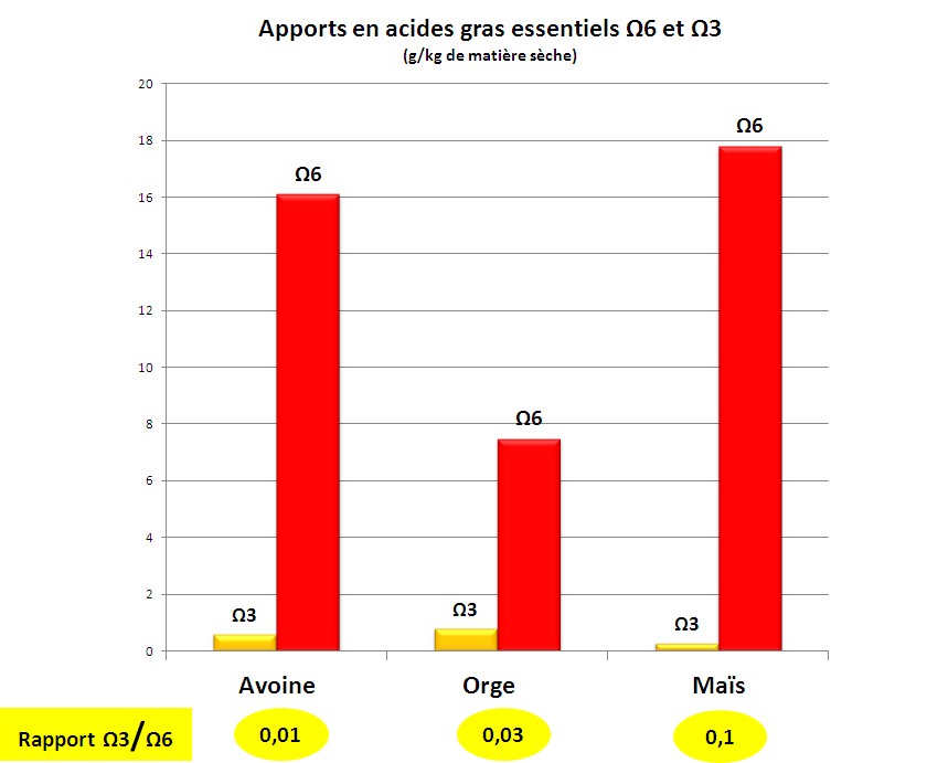 La ration « herbagère » d’un cheval, qu’elles soient à base de fourrages pâturés ou conservés contient toujours plus d’oméga 3 que d’oméga 6. (Ω3 / Ω6 > 1)
