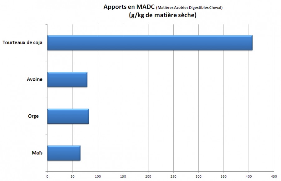 MADC (Matière Azotée Digestible Cheval): Partie des protéines brutes réellement assimilable par le cheval.