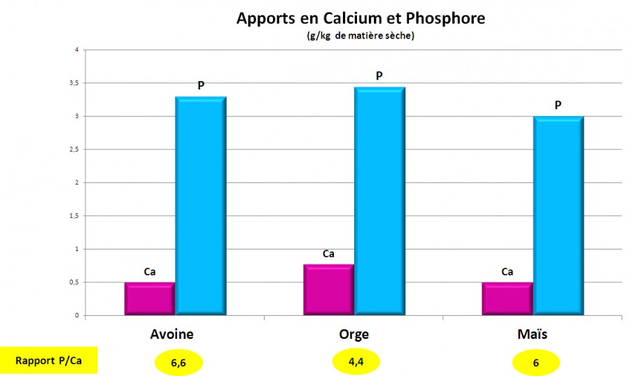 Si la quantité et proportion de calcium apportée n’est pas adéquate, le cheval devra puiser dans ses réserves osseuses pour maintenir la calcémie amenant à une déminéralisation et une fragilité ostéo-articulaire. L’utilisation de céréales impose donc de rééquilibrer les apports en minéraux, principalement en calcium.