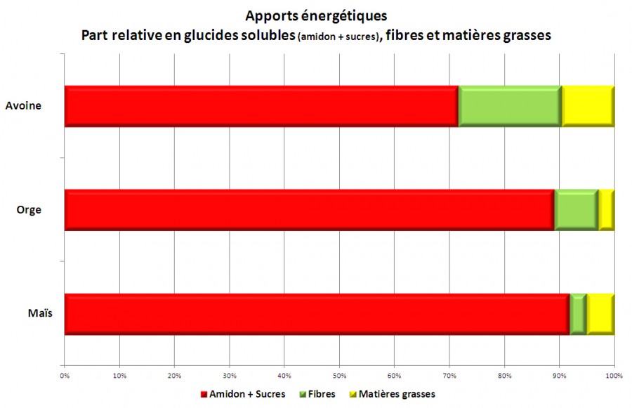 Parmi les céréales usuelles, l’avoine s’est imposée parce qu’elle est, pour le cheval, la plus équilibrée des céréales, en terme de profil énergétique : la plus riche en fibres et matières grasses, et la plus « légère » en glucides solubles (amidon + sucres).