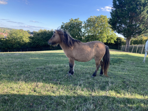 Présentation : Bambine renommée Bambi est une ancienne poulinière shetland vivant au pré avec juments, poulain et l'étalon elle n'avait pas énormément d'interactions avec l'humain.