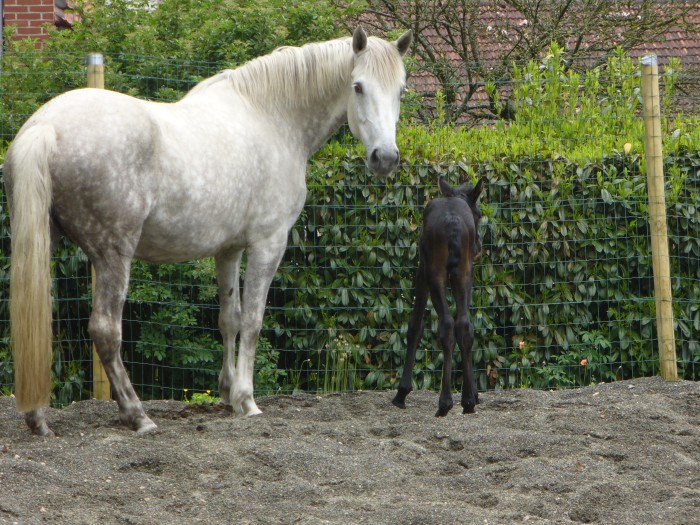 Mes deux juments vivent près de chez moi, au pré avec stabulation libre : ma première juments est une SF de 26 ans maintenant, que j'ai achetée à 4 ans et avec laquelle je suis sortie en dressage et TREC. Elle n'a malheureusement jamais réussi à me donner un poulain. La plus jeune a 6 ans, c'est une onc que j'ai moi même débourrée, un véritable bulldozer qui n'a peur de rien, même pas des clôtures électriques !!