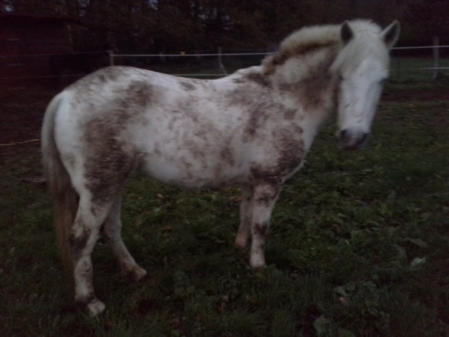 Ma jument est grise truitée, et le sol argileux de son pré est très collant !!!!!