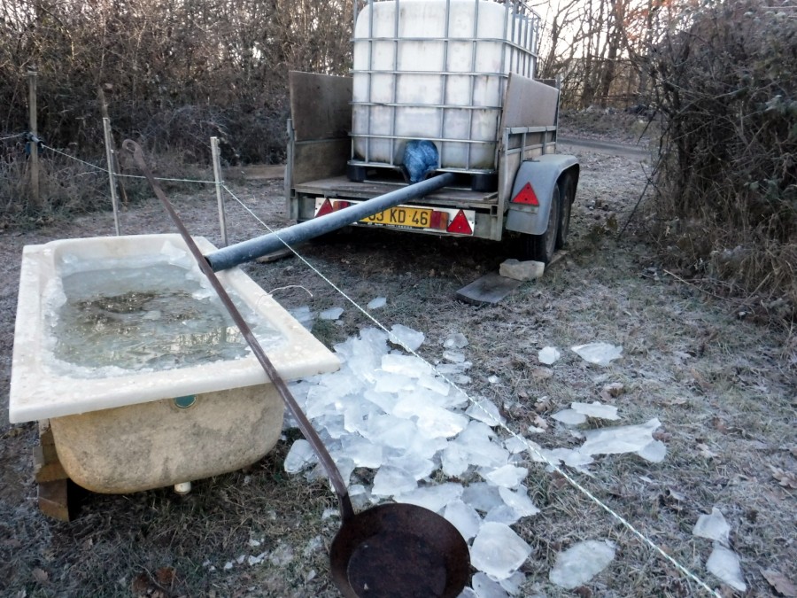 ( Je suis chez des gros radins qui m'ont dit il n'y a pas longtps que lorsque je cassais la glace, fallait la remettre dedans pour pas "gâcher" d'eau.... . Bon, ils sont aussi radins sur le foin. C'est pour ça que je me casse dans un peu plus d'1 mois !!! )