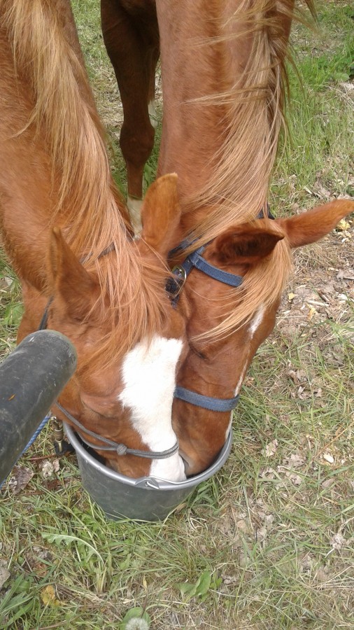Et pour illustrer, photo de mon rouquin et son pote qui avait une grande soif ! Ils sont tous les deux alezans, même taille, quelques ressemblance niveau morphologie et copains ! Du coup on nous a demandé à plusieurs reprises s'ils étaient frères