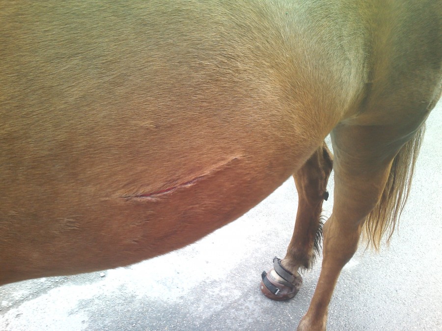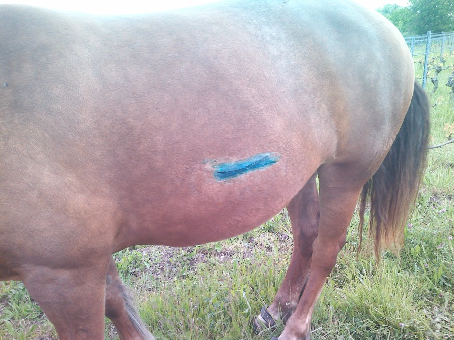 un coup de "barbelé" je pense (oui, c'est de la m***e ses barbelés ) Quand je suis arrivée , elles etait toute inquietes et galopaient dans tous les sens (pour une fois que je viens le matin à 9h ....) D'ailleurs elle est venue toute de suite quand elle m'a vue : "au decours" puis j'ai vu son "balafre" (bon heureusement que ce n'est pas tres profond ,mais ça n'arrêtait pas de "bailler" comme c'est sur le ventre et c'etait encore "tout frais " Cet apres-midi c'etait plus joli mais encore très sensible ! J'ai donné de l'arnica (puis un doute sur de l'apis mellifica (comme c'est enflé et chaud ?? des avis ...? ) Puis j'ai mis juste le gel pour ne pas tout mélanger , on verra demain Bon il pleut alors pas de mouches !!
