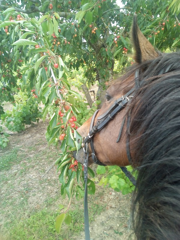 Plus huit, on a travaillé l'accélération du galop, le trot assis trop rapide pour moi, pis on a mangé des cerises...Des cerises volées.
