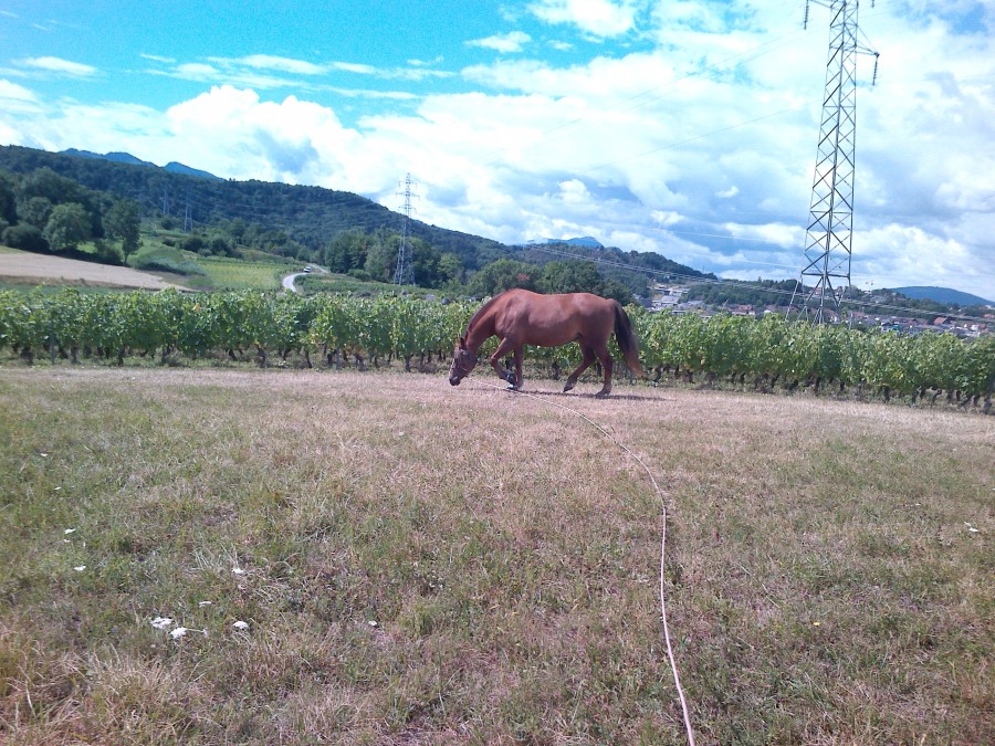 ce matin j'arrive au parc je regarde les pis a Mia : "ouf , ça a dégonflé" Alors on va faire un tour en LR vers des chemins qu'on n'a pas pris depuis longtemps ... Il y avait pleins de raisins (pas mûrs et traités) dans le parc , je pense que des gens ont essayé de leurs donné comme il y a des vignes juste à côté
