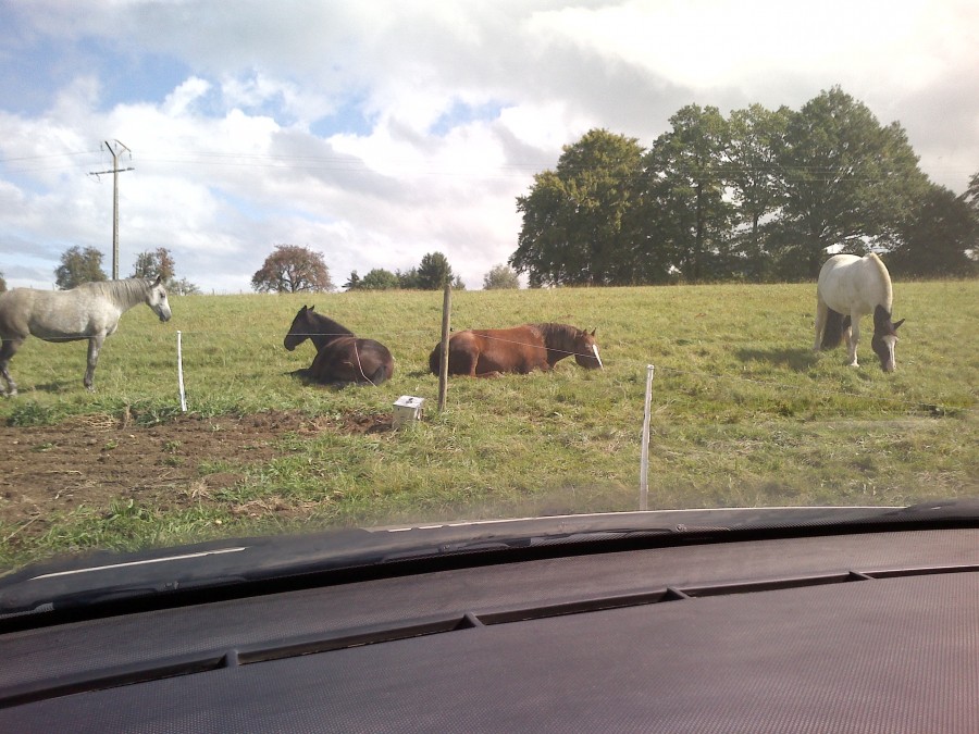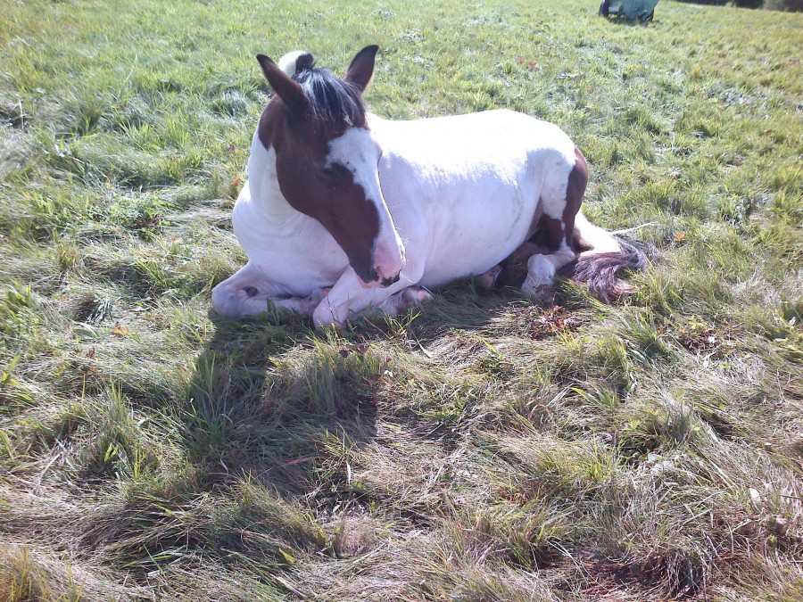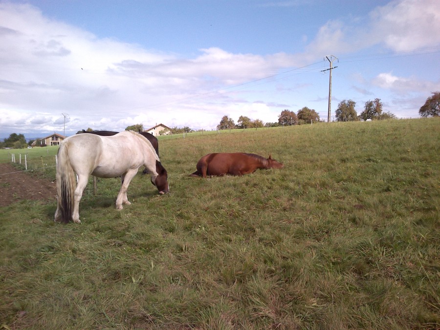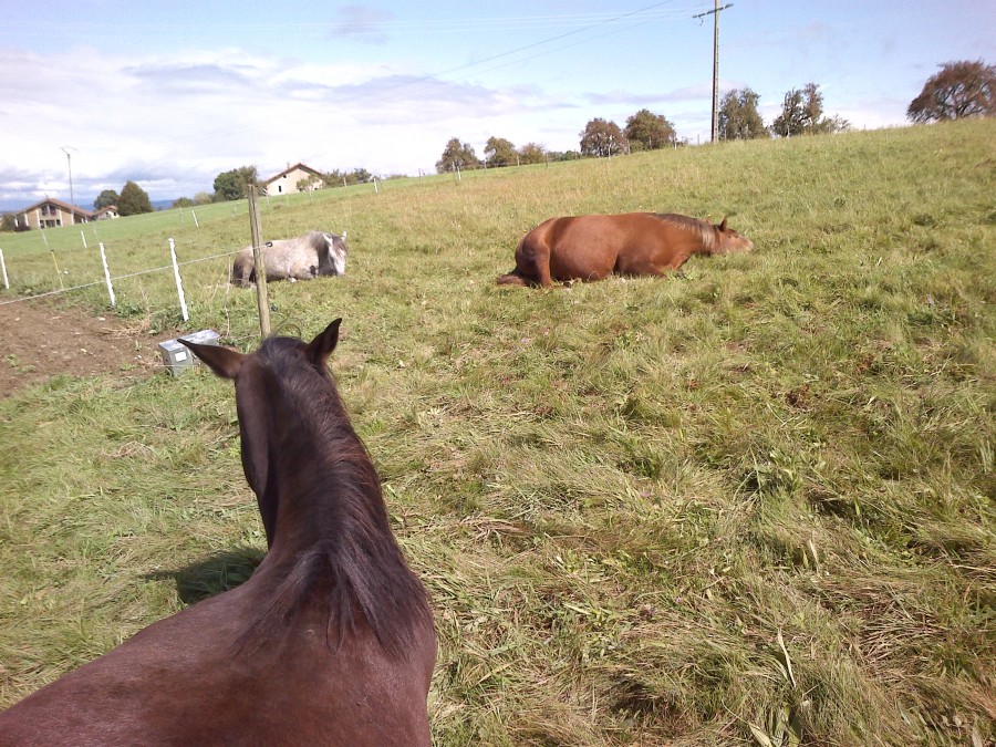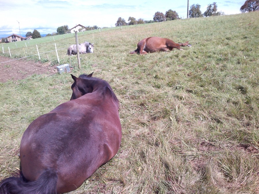pas de ballade encore aujourd'hui mais un beau moment avec les juments . Quand j'arrive au parc Mia et beauty sont couchée et font la sieste . Il y avait un peu de soleil (enfin) apres toute cette pluie et elles se reposaient (alors je ne les perturbe pas !!)