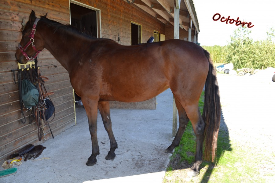 Édit: Le ventre de poulinière, est le terme de la saddle fitteuse pour expliquer que Time n'est pas grosse mais elle a un ventre qui monte haut et de larges épaules, ce qui fait un passage de sangle étroit.