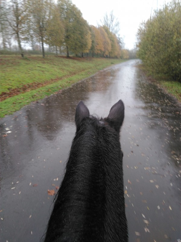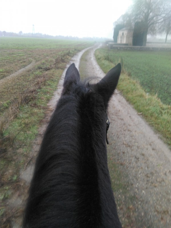 Simbad impec, un peu plus expressif - j'ai eu le droit à un joli demi-tour au galop à cause d'un truc derrière un portail. Mais il a tout passé. Ça canardait sec, on a croisé 3 chasseurs et des chiens, et pas mal de coups de feu. On est quand même resté en forêt, à se faire de jolis petits galops équilibrés. Il ne s'arrête même plus dans les cailloux, il ralenti juste. Franchement top. Et pas un mouvement d'humeur, là où mercredi dernier il m'avait légèrement pris la main pour le dernier galop.
