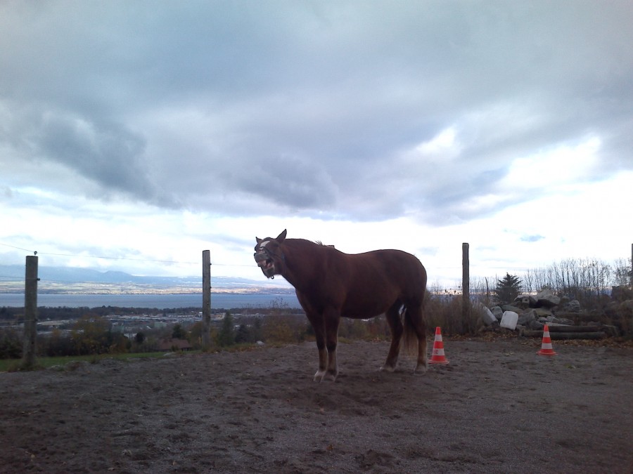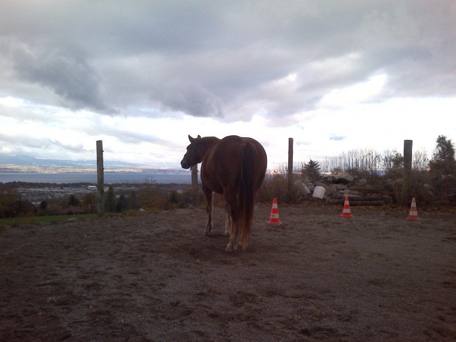 pas de nouveau kms , entre la tempête et la pluie et/ou neige pas facile alors on s'est encore "abritée" dans le rond de longe pour une seance de "cavaletti EDF" pour qu'elle bouge un peu et s'entraîne a etre plus habile de ses pieds .....