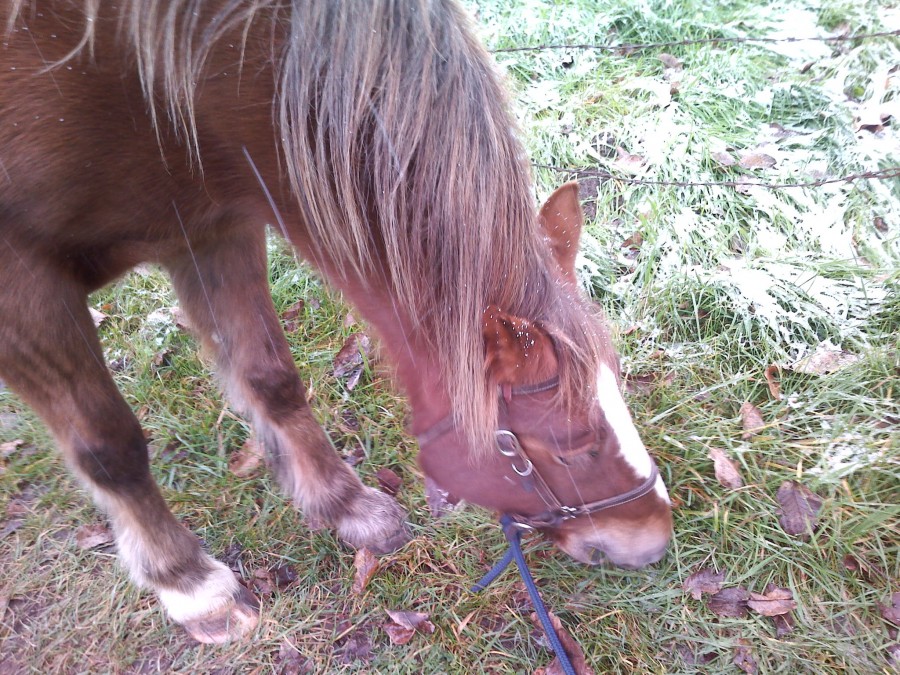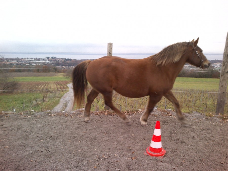 Aujourd'hui on a joué dans le rond de longe en liberté (j'avais mis son bridon/licol et je trouve que ça lui sert trop la tête (en comparaison avec le licol etho qui ne semble pas la gêner )