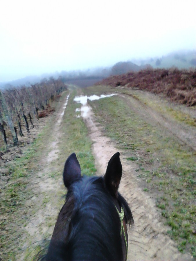 Tranquillou au pas sous un ciel nuageux et brumeux mais on a eu de la chance pas de pluie, juste une fine bruine au départ!