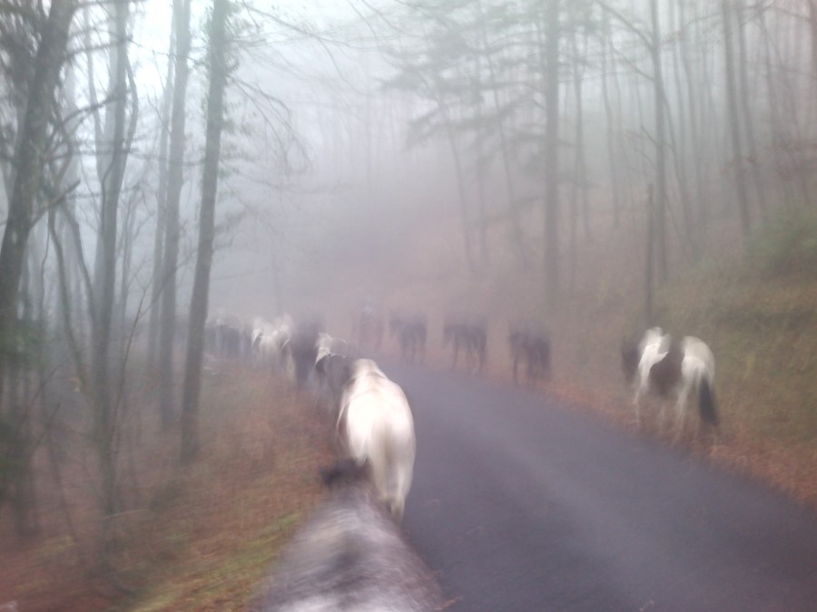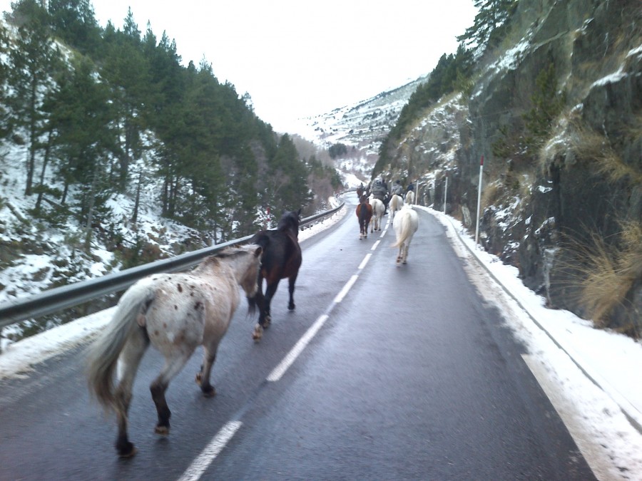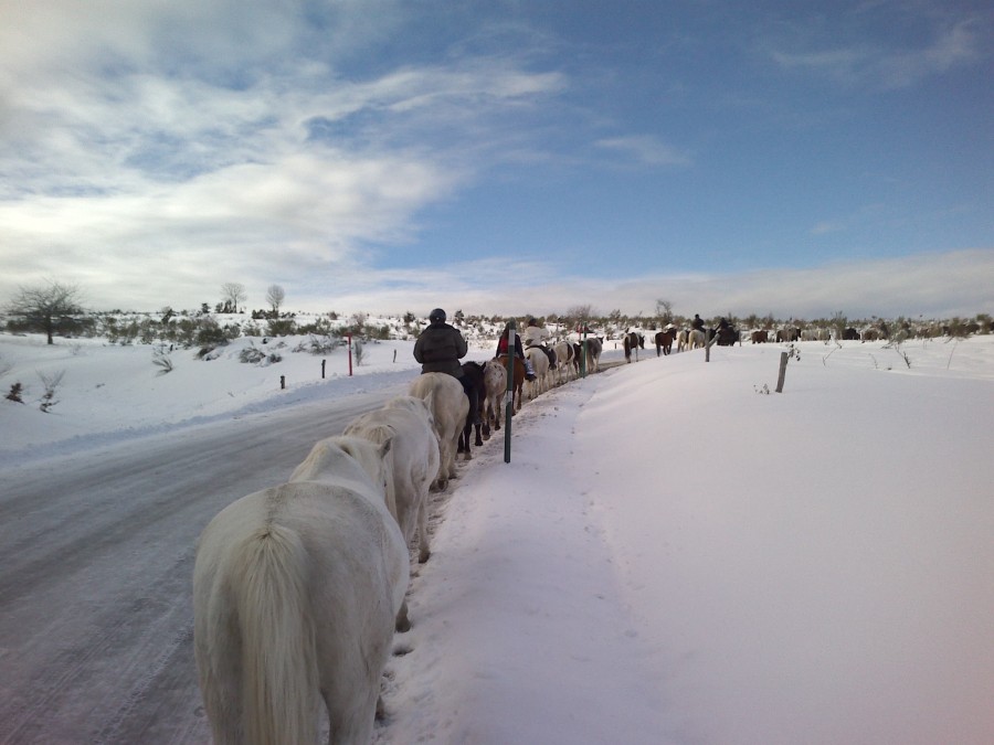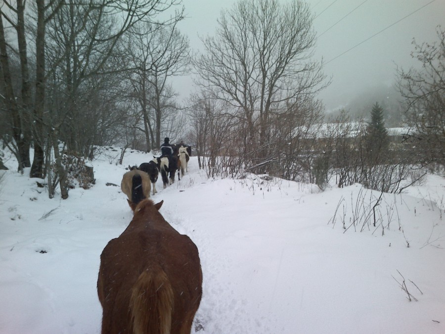 C'etait assez impressionnant car un troupeau de 70 chevaux en mouvement est en fait plusieurs plus petits troupeaux réunis et le deplacement n'est pas toujours "controlé" . Puis le troupeau entier etait pieds nus et sans mors !! Je peux vous "rassurer" que ils ont tous chercher les bas côtés de "preference" (et les ronces et les branches divers et variés ) mais entre la glace ,la neige ,la boue et les galops plein balle en descente pour rejoindre le troupeau , ils ont les pieds assez sûrs ... La direction par contre etait parfois plutôt dirigé par le cheval et le troupeau car "inutile" d'essayer de guider un cheval en gentil bride sans mors si le troupeau va ailleurs ;même si on est tombé sur un gentil cheval .