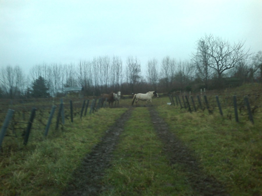 j'avais mis le pantalon de pluie et l'impermeable pour sortir à pied ...On a fait le tour des vignes (encore) car dans les bois c'etait toujours un peu risqué avec les rafales de vent : 2.4 kms