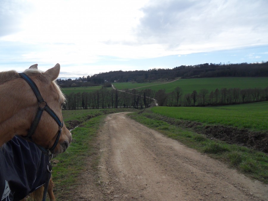 Puis on a fait un peu de vignes ,puis du bois ,puis de la route ...Mais au trot je vois bien que c'est dur ,alors je n'ai pas forcé car elle ne marche plus "talon d'abord " .Demain on mettra les boots au moins aux anterieurs !!