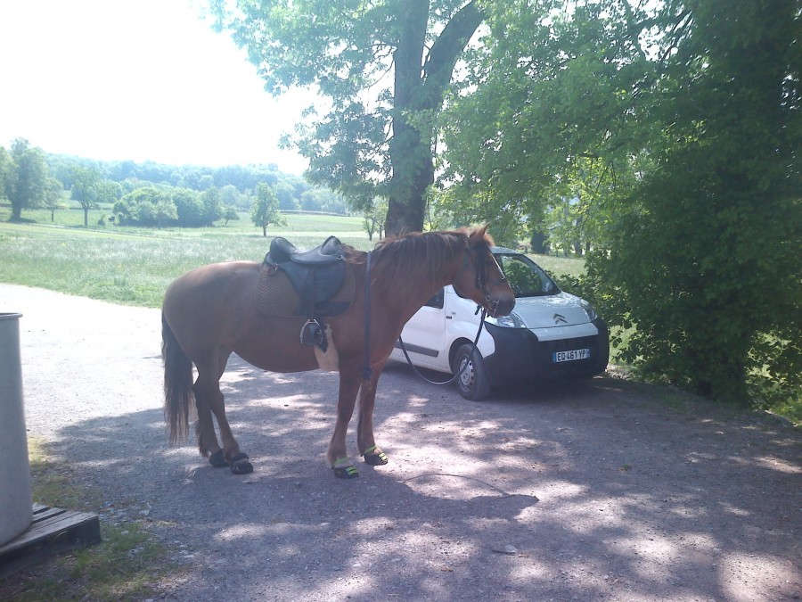 Il faisait chaud elles ont transpiré . Bon on n'a pas fait des records de vitesse ;mais difficile de faire mieux avec tous les caillasses malgré les boots mais ça semble etre assez fluctuant et parfois elle marche quand même sur la route et ne cherche pas les bas-côtés