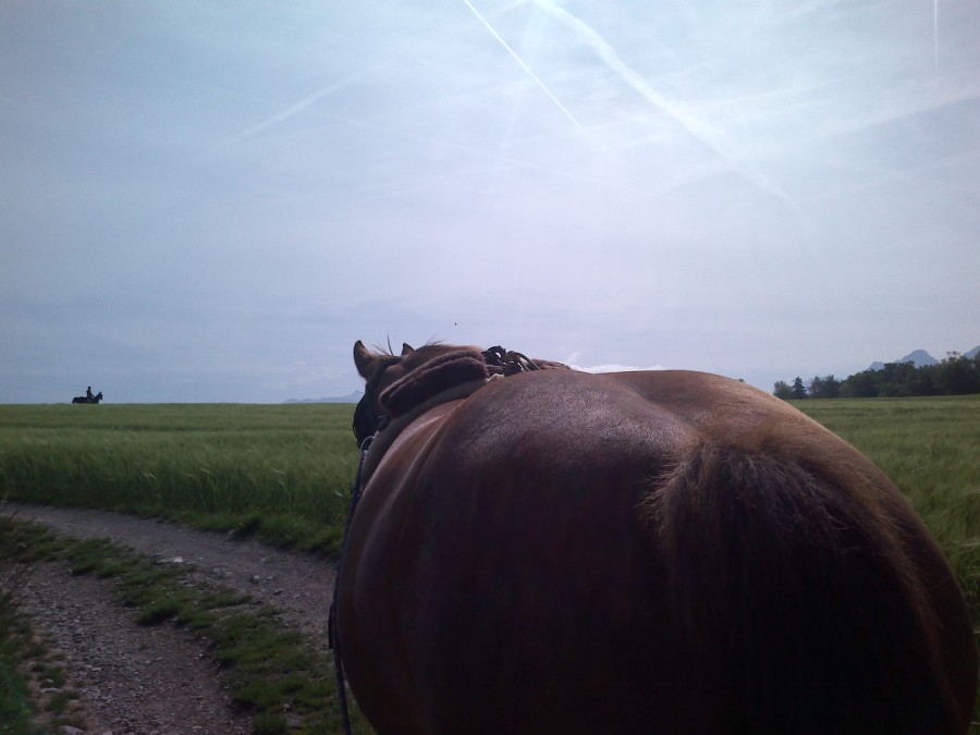 Mia etait contente d'avoir d'autres chevaux comme compagnie et ça l'a motivé pour marcher un peu plus vite puis elle leur a lançé un petit brouhouhou quand on a pris le chemin du retour (et eux aussi mais c'est à l'opposé)