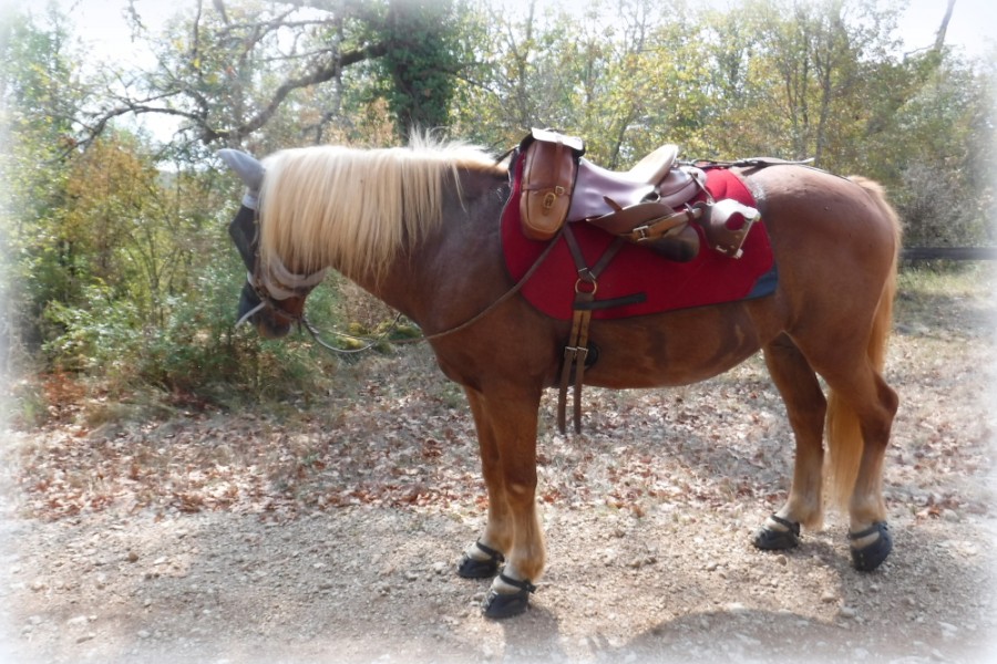 C'était un petit tour après une séance en carrière, première sortie monté et seuls dans cette écurie avec un loulou très courageux à l'allée. Il a légèrement bloqué sur le retour pour une raison que j'ignore toujours et a manifesté son mécontentement en me balançant UN postérieur quand je me suis fâchée, j'ai un cheval très fougueux comprenez