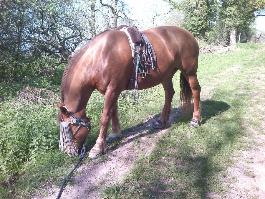 7.3 km en LR Mia a transpiré (juste des posterieurs ;là où ça a travaillé en fait ) J'avais mis les boots qu'aux anterieurs vu comme la corne est dur sur les posterieurs !! ça a bien été Bon au départ elle n'etait pas trop motivée ,j'ai fait qqs petites pauses "broute" pour la motiver Puis après ça a bien été . Elle a juste eu peur une fois d'ine remorque à eau dans un champ vide et un moment elle etait prête à faire demi-tour alors j'ai dû lui dire "non tu ne peux pas " et je l'ai gardé face à sa "peur" en lui autorisant de reculer qqs pas et de regarder puis on est passée ;puis j'ai fait demi-tour et on est repassé ;puis c'etait mieux alors on a refait demi-tour et là c'etait bon . Puis on a fait qqs trots .