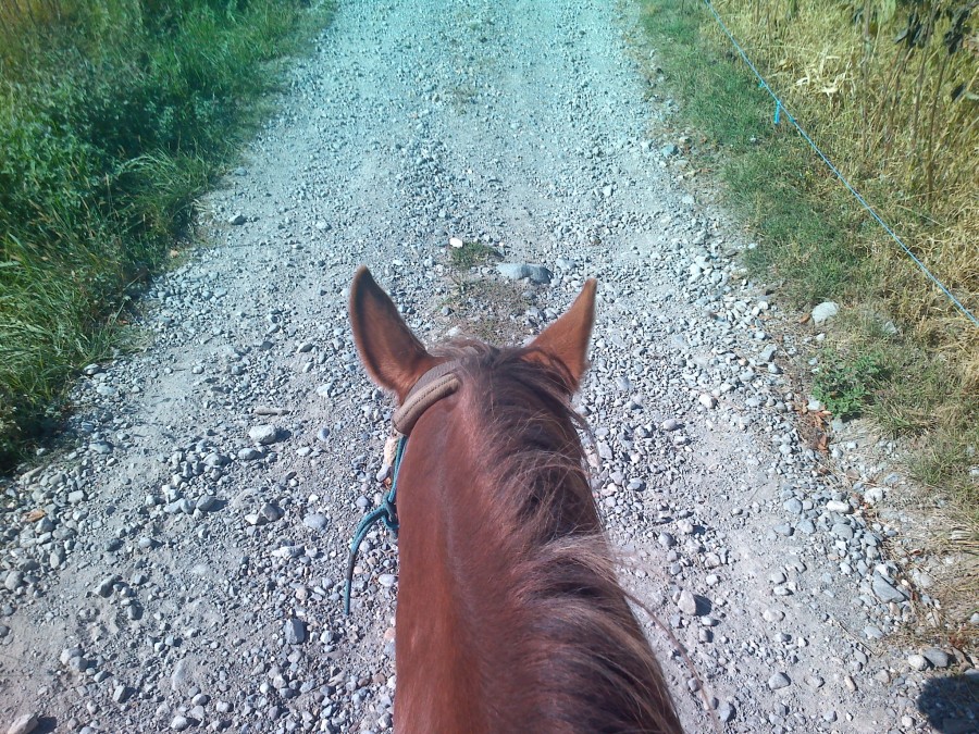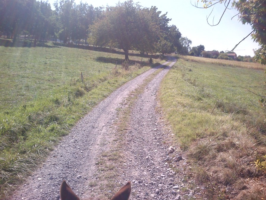 Sinon nous on a bien marché avec des bouts de trot et les boots qu'aux anterieurs (plus je la fait marcher pieds nus et plus ça pousse les posterieurs on dirait ;ben oui : normal mais la route ne semble pas les user beaucoup hein . Je n'ose pas encore enlever les boots aux anterieurs ;mais je vais peut-etre pas remettre des semelles quand elles seront usées . Puis on s'est fait "rattraper" par les chevaux du centre equestre ,je ne me rappelais pas que ça fesait autant de bruit les chevaux ferrés ;puis comme ils ont fini par nous doubler ;Mia a encore bien marché ;motivée par les chevaux devant (mais s'est fait distancer quand même )