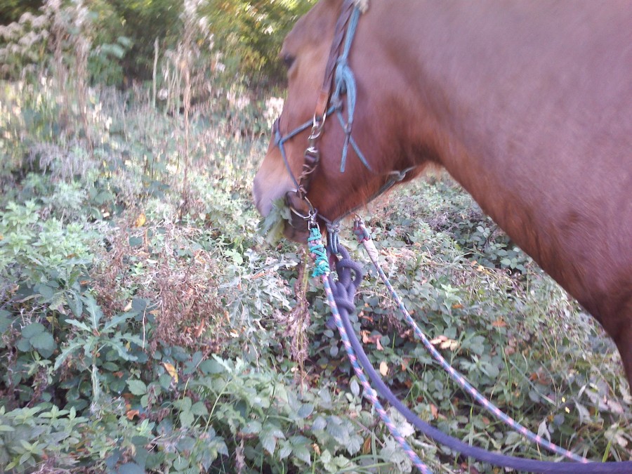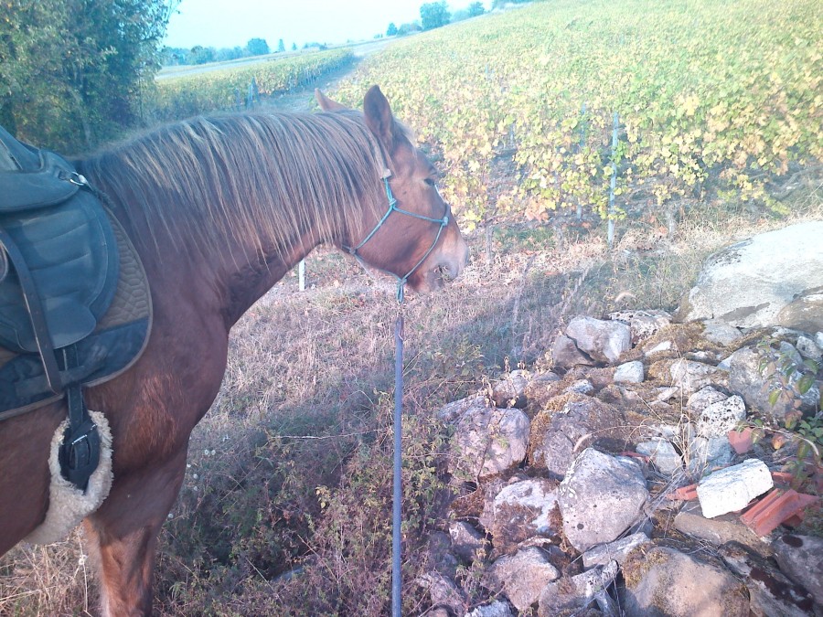4.9 km en mode "cool" balade gustative avec la proprietaire de la trotteuse qui à fait monter une collègue sur sa jument et du coup l'a tenu en longe pendant la balade (c'est la seule qu'etait à pied ) Moi je suis monté mais juste en licol comme ça c'est plus facile pour manger . J'ai fait qqs petits trot pour les rattraper par moment .