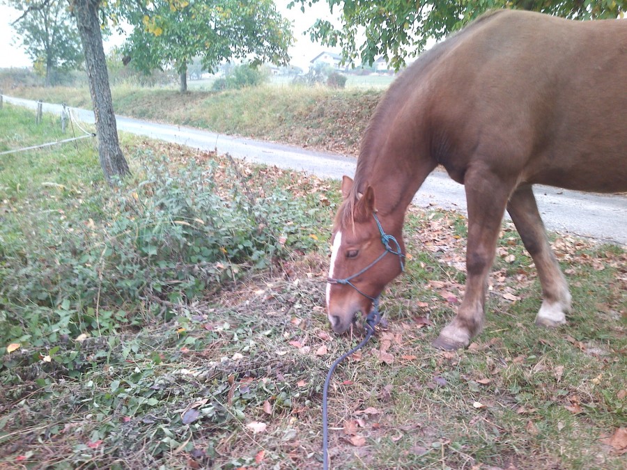 on a trouvé une belle pomme en cours du chemin ;puis dans le bas côté en arrivant Mia a mangé sa dose de chardons ?!