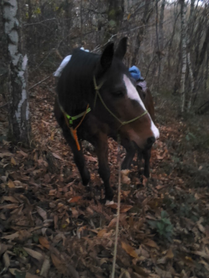 +5,82kms ce soir, on a fait demi-tour car il y avait un arbre en travers du chemin et flemme de passer par en haut, du coup je pensais faire une boucle par un autre coté pour rentrer, mais on s'est arrêté ramasser du houx, et après vu l'heure j'ai préféré rentrer pour éviter la nuit et puis pas hyper motivé pour faire plus long. J'étais partie avec licol et cordelette mais j'ai gardé la longe du licol en main, pas possible a la cordelette, Glinski trébuchait et glissait souvent, j'avais trop peur qu'il s'éclate le nez parterre si je ne le "rattrapais" pas avec la longe. Du coup je me suis posé pas mal de questions pendant la balade. Est-ce ma position? Je fais attention pourtant ces temps-ci. Est-ce qu'il a une douleur ? Un blocage ? Ou Est-ce parce qu'il n'est pas motivé ? Est-ce qu'il dort même si j'arrête pas de lui parler ? Est-ce les fers ? Bon certes c'était glissant car un peu boueux mais au final je pense surtout que c'est les fers qui sont usés et lisse (ils ont plus de 2 mois) et comme il est déferré derrière, je me demandais si déferrer devant aussi il ne serait pas mieux (avec des boots pour les balades ou il y a des cailloux),... J'en parlerais avec l'ostéo (c'est elle qui m'avait conseillé de déferré derrière il y a deux ans).