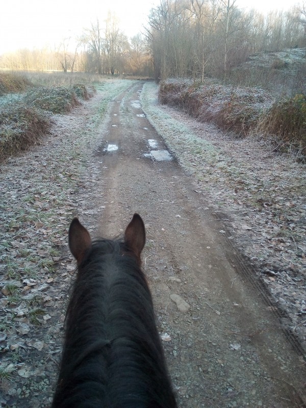 15 km hier.... j'avais prévu de profiter de deux jours de sec pour sauter, mais il y avait du soleil pour la première fois depuis des lustres, je me suis dit que c'était un jour pour sortir.... Froid sec donc, chemin trempés par contre, givré, très beaux. Par contre dès que le soleil c'est couché, j'étais gelée...Mon cheval se retenait beaucoup, j'espère qu'il a mal nulle part.... ça lui arrive de faire ça quand il est inquiet, mais la non, il serrait juste les fesses...