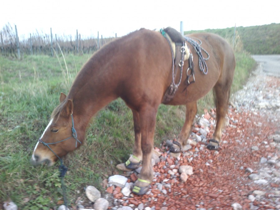 2 km ce jour avec une petite seance de hill-therapie . Elle m'attendait encore à l'entrée malgré e foin qu'on a mis hier .....Elle préfere l'herbe verte . Mais comme elles ont du foin j'ai passé moins de temps à la laisser brouter . Par contre elle semble avoir "grossi" des pieds (anterieurs) et du coup les boots sont un peu juste (je mettrai peut-etre les renegades demain quand on monte avec la trotteuse ;mais faudrait rester sur du "non-boueux" car ils n'ont plus beaucoup de profil .
